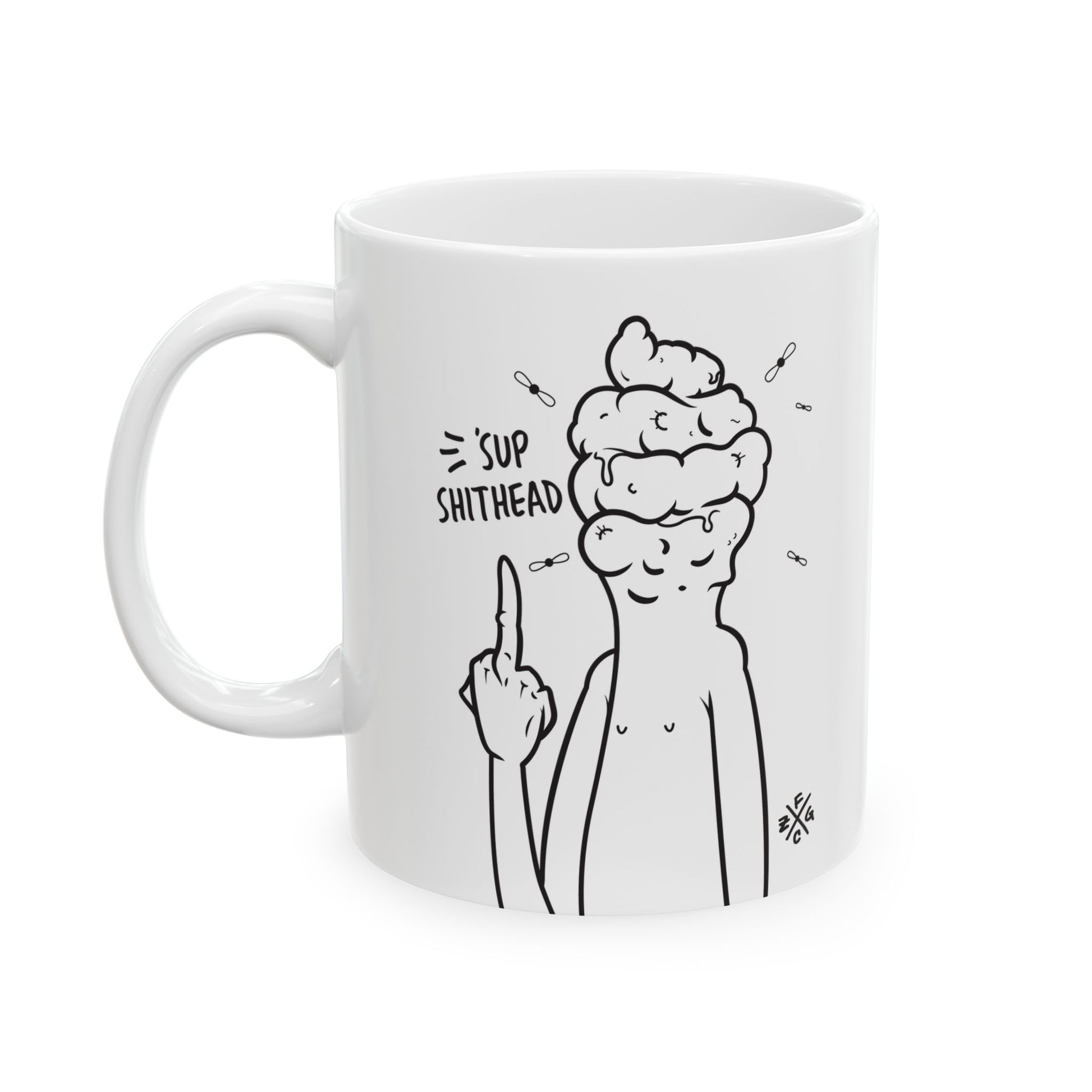 This funny and rude ceramic mug rocks a 'Sup Shithead' accompanied by a hilarious graphic of a true shithead. Perfect for coffee lovers with a sense of humor, this mug adds a touch of fun to your morning routine. This mug is perfect for gifting on birthdays, holidays, or as a novelty present for friends and family.