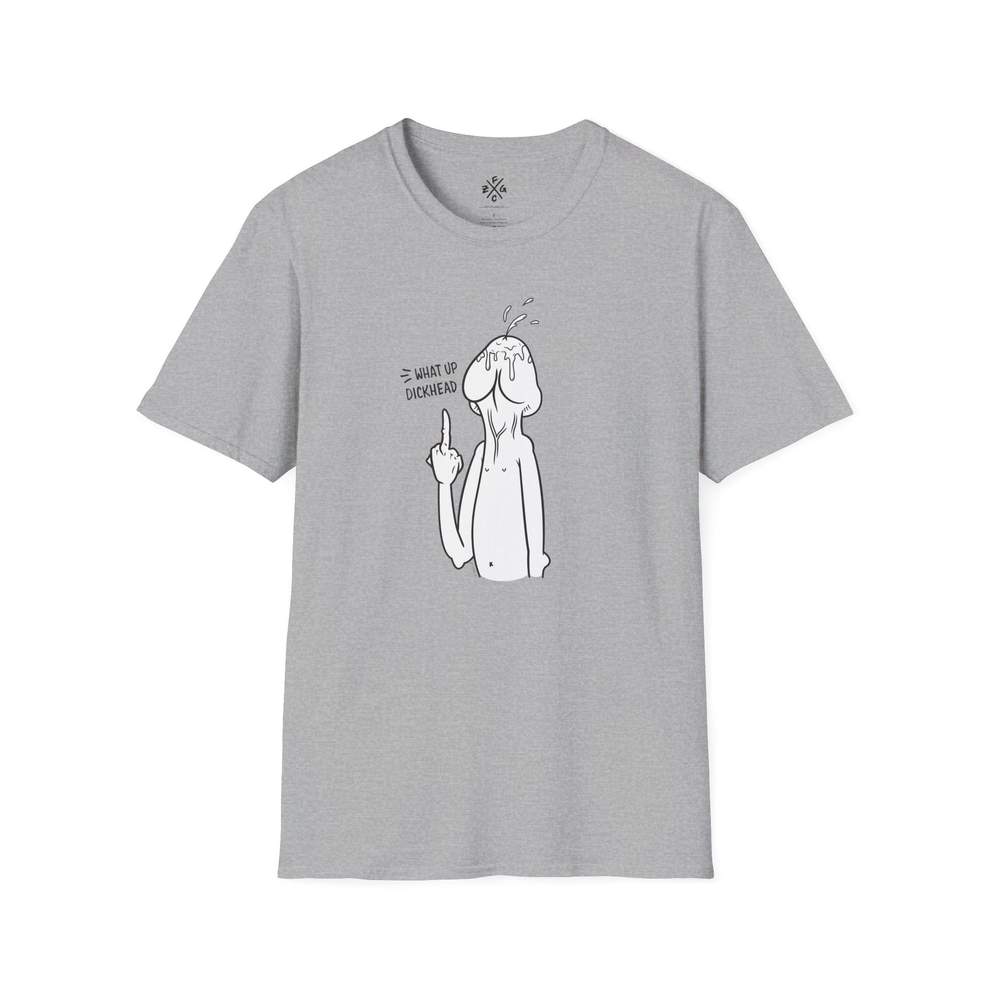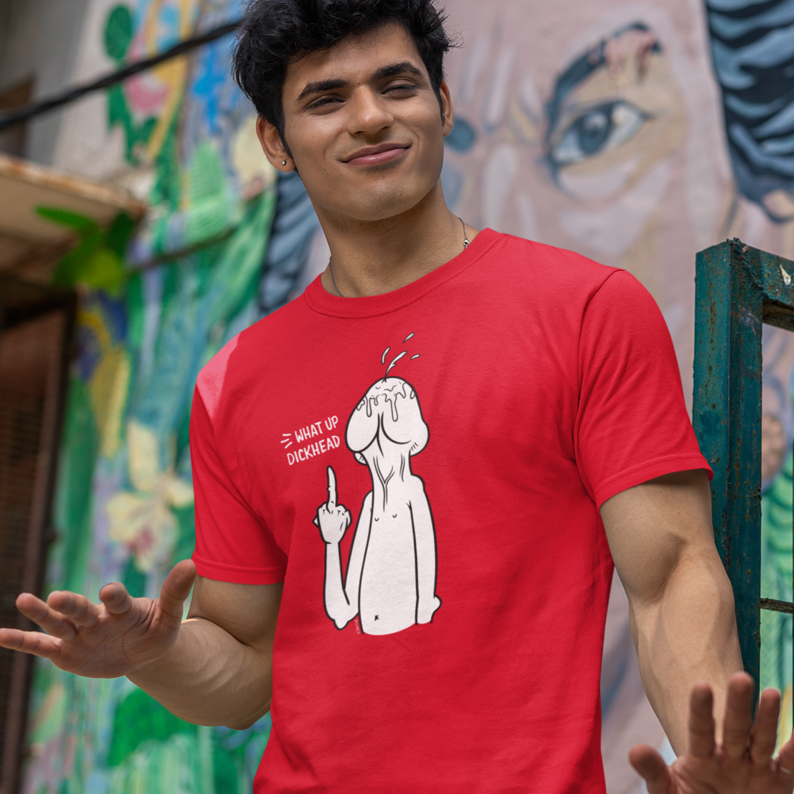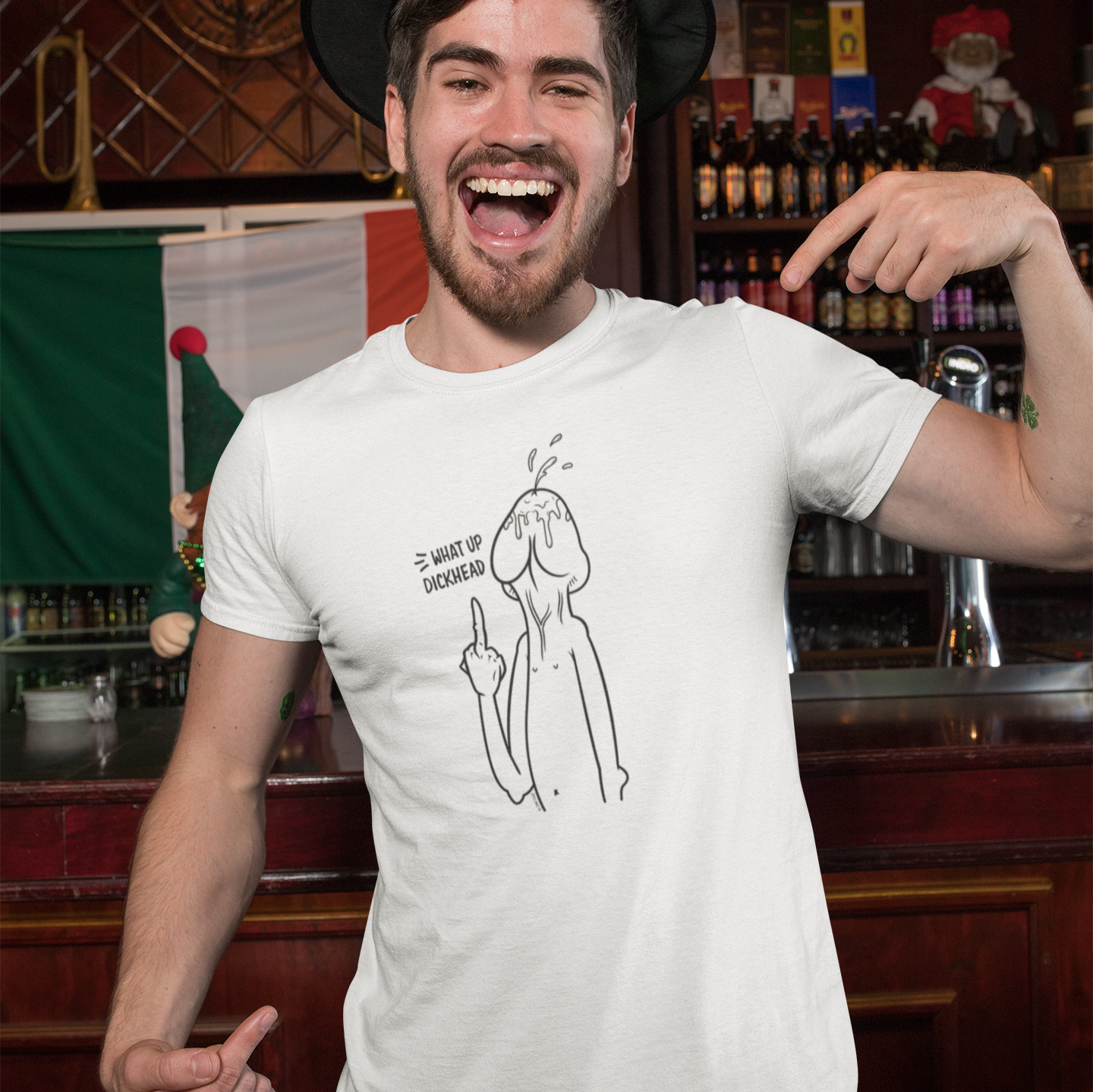 "What up dickead?!" Turn heads and get laughs with this hilarious T-Shirt featuring a true dickhead, flippin' the bird with bulging veins, drippy tip, and all! This shirt is perfect for those with a sense of humor and love for unconventional fashion. This T-Shirt is comfortable to wear all year round and can be a conversation starter at parties or gatherings. Ideal for individuals who enjoy edgy and bold clothing choices or just want to piss a few people off.