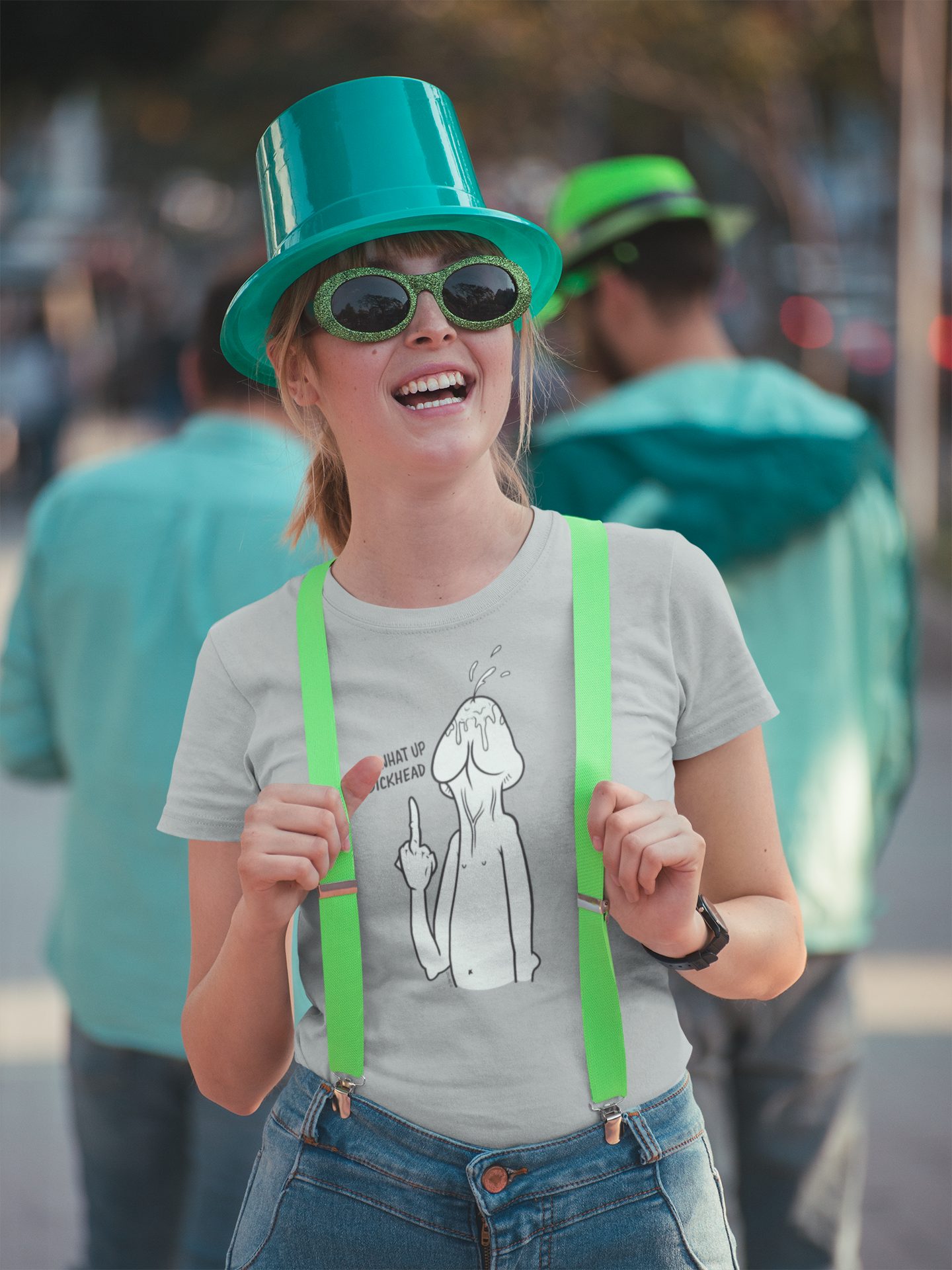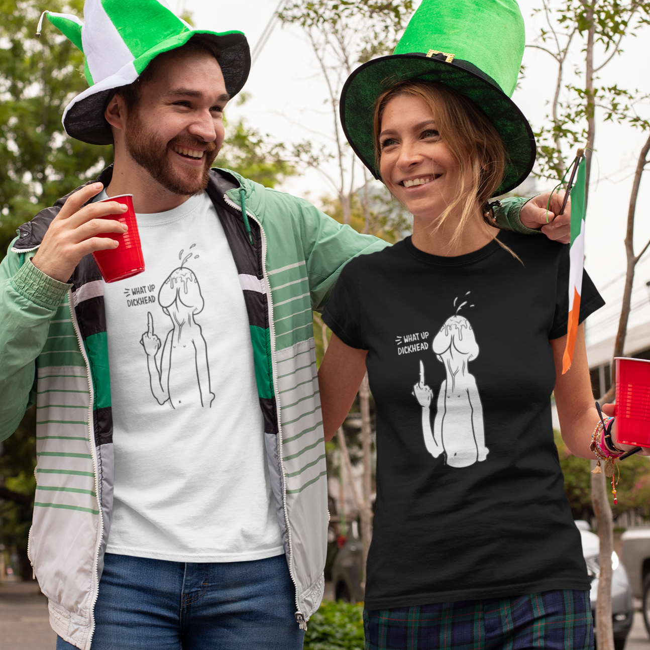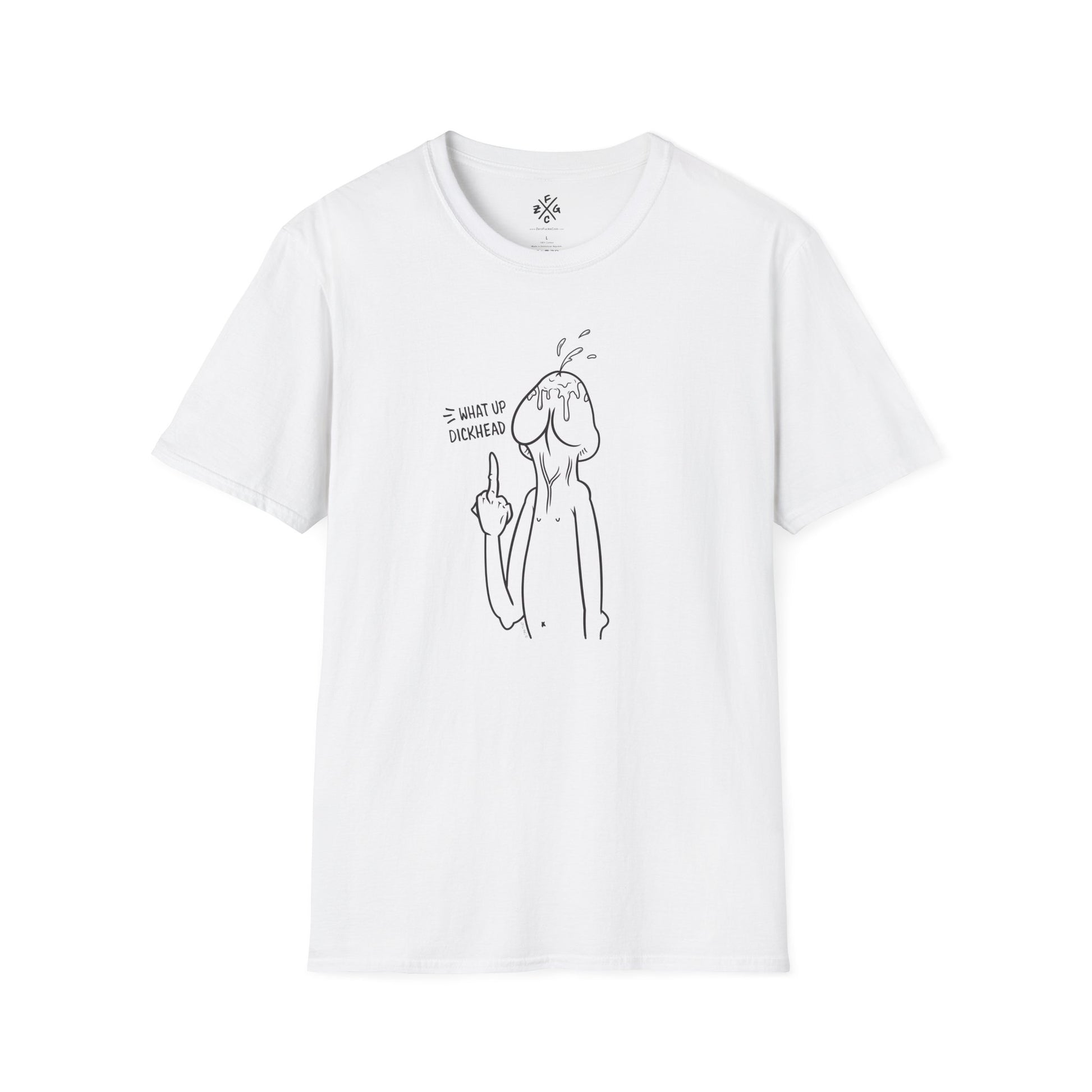 "What up dickead?!" Turn heads and get laughs with this hilarious T-Shirt featuring a true dickhead, flippin' the bird with bulging veins, drippy tip, and all! This shirt is perfect for those with a sense of humor and love for unconventional fashion. This T-Shirt is comfortable to wear all year round and can be a conversation starter at parties or gatherings. Ideal for individuals who enjoy edgy and bold clothing choices or just want to piss a few people off.