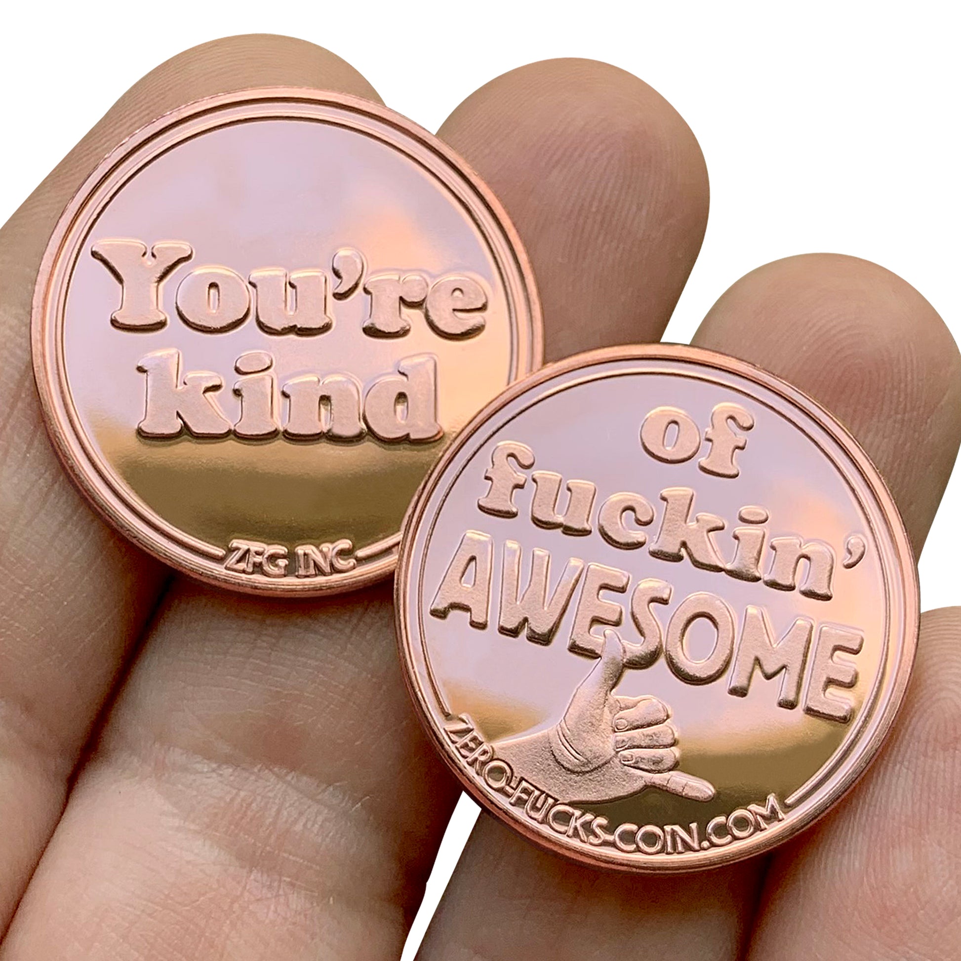 At first glance, the recipient of this coin will smile as they read the heart warming "You're Kind" on the front of this radicle token of appreciation. Only after they flip the coin over will they realize how fuckin' awesome you think they are!